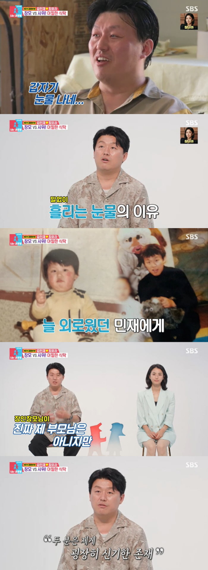 김민재는 "가족하고 오래 떨어져있다 보니까 모성애를 느끼면 울컥하나 보다"라고 밝혔고 장모님은 "남편들이 모성애를 아내한테 얻으려 하나.